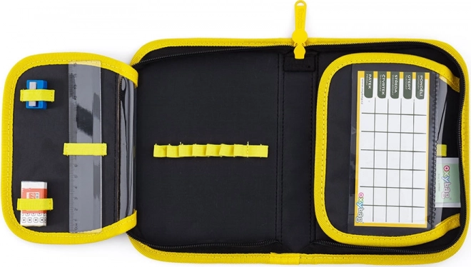 Estuche de una sola planta con posibilidad de fijar diversos útiles escolares, equipado con lámina transparente para el planificador de clases.