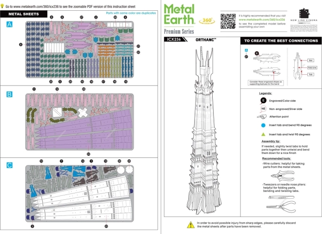 El montaje se realiza sin pegamento: las piezas se extraen de las láminas de acero y se conectan mediante encajes que se aseguran doblando pequeñas pestañas. Para un trabajo más cómodo, se recomiendan cortaalambres pequeños y alicates de punta fina (no incluidos). La recompensa es una pieza maestra realista con la imponente silueta de la torre.