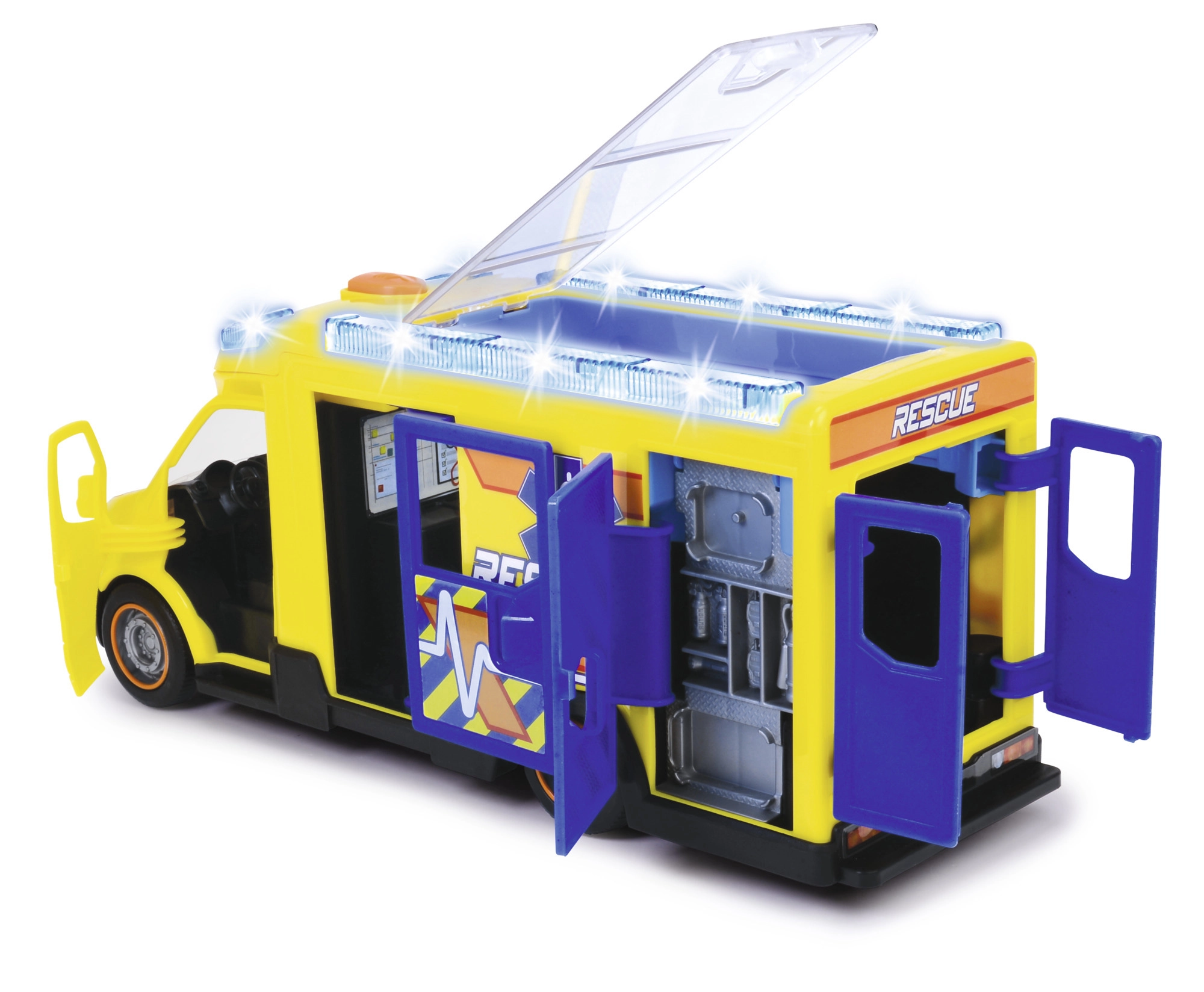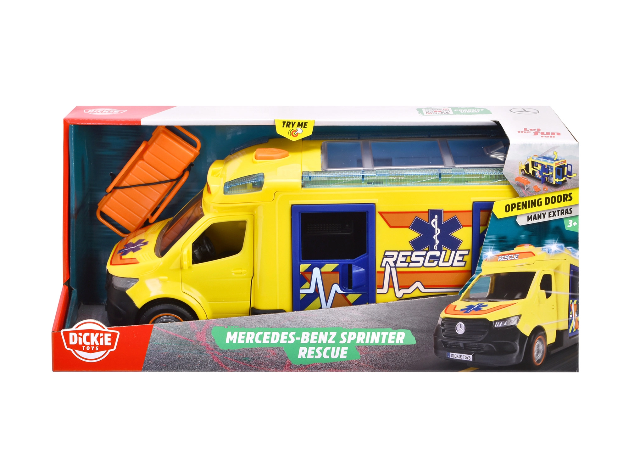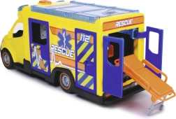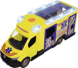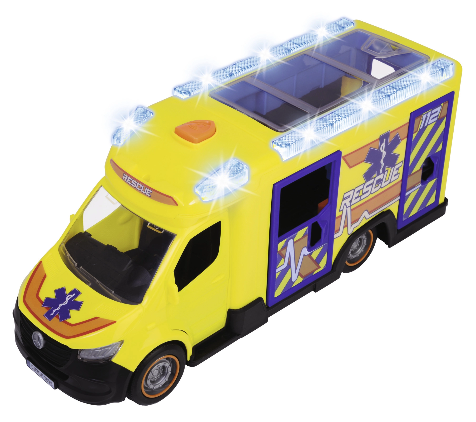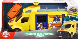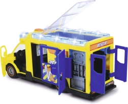 Este Mercedes-Benz Sprinter de Dickie Toys ofrece una auténtica experiencia de rescate con funciones de luces y sonidos. El vehículo cuenta con puertas del conductor y del acompañante, así como puertas laterales y traseras abatibles y un techo transparente, lo que permite acceder a un interior detallado.