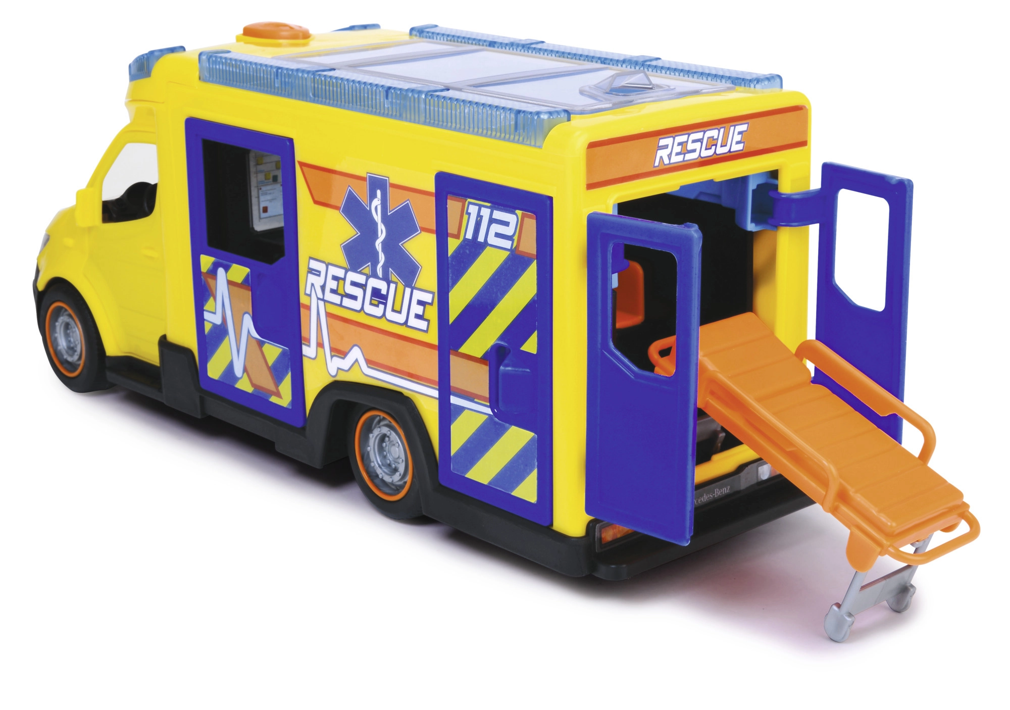 El vehículo de rescate Mercedes-Benz con licencia oficial ofrece un gran espacio de juego con una longitud de 34,5 cm.