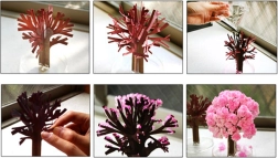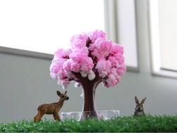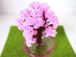 Tras el riego, en pocas horas se forman delicados cristales rosados que imitan la sakura en flor y transforman el sencillo arbolito en una decoración llamativa.