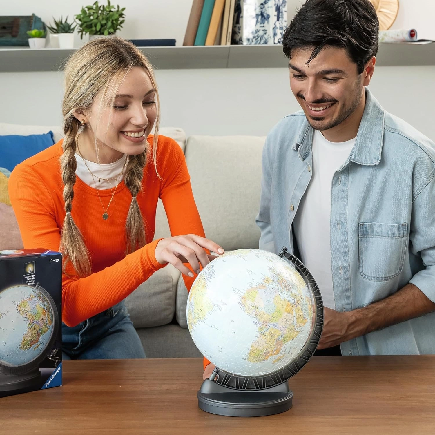 Este globo terráqueo 3D premium de 22 cm de diámetro se compone de 540 piezas de plástico rígidas y ligeramente curvadas que encajan a la perfección. Una vez montado, forma una esfera lisa y sólida colocada sobre una base estable con latitudes geográficas marcadas. Gracias al módulo LED integrado, el globo ilumina de manera impresionante y se convierte en decoración y recurso educativo.