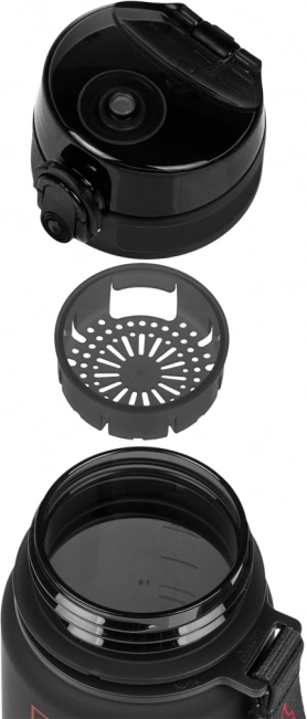 La tapa bloqueable con seguro evita aperturas accidentales en la mochila y el mecanismo flip-top permite beber rápidamente con una sola mano. El colador extraíble es perfecto para limonadas con fruta o tés a granel; el material es apto también para bebidas calientes. Incluye una correa para un transporte cómodo.
