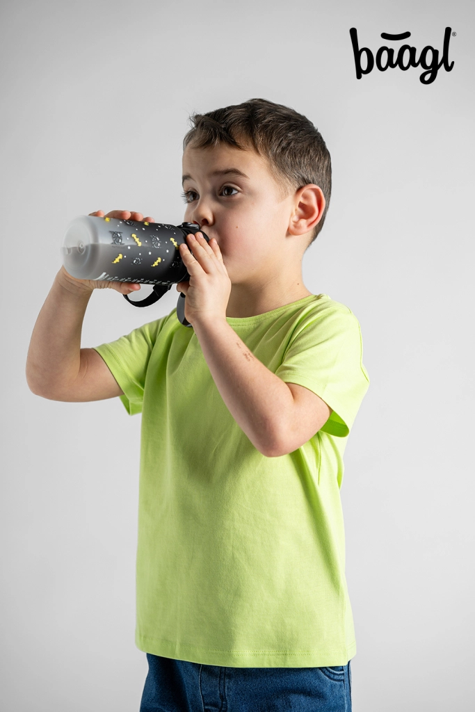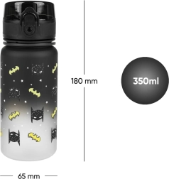 Una botella con diseño degradado y logos amarillos de murciélago que encantará a cualquier fan de BATMAN. Está hecha de tritán certificado sin BPA, PVC ni ftalatos, que no absorbe olores y es inocuo para la salud; el mismo material se utiliza en el sector sanitario. La capacidad de 350 ml es ideal para niños y adultos en la hidratación diaria.