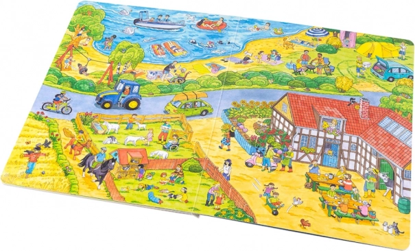 Este libro de gran formato es ideal para leer y narrar en compañía. Los niños conocerán lo que sucede en la ciudad de la mañana a la noche: desde el trabajo de los basureros y las compras, pasando por la guardería, la obra, los bomberos y la policía, hasta la diversión de la tarde en el parque y las excursiones al lago o a la granja. Cada página está llena de estímulos para conversar y buscar detalles.