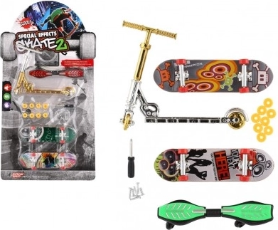 - 2× mini monopatín, 1× scooter de dedo, 1× waveboard, ruedas, tornillos, mini destornillador