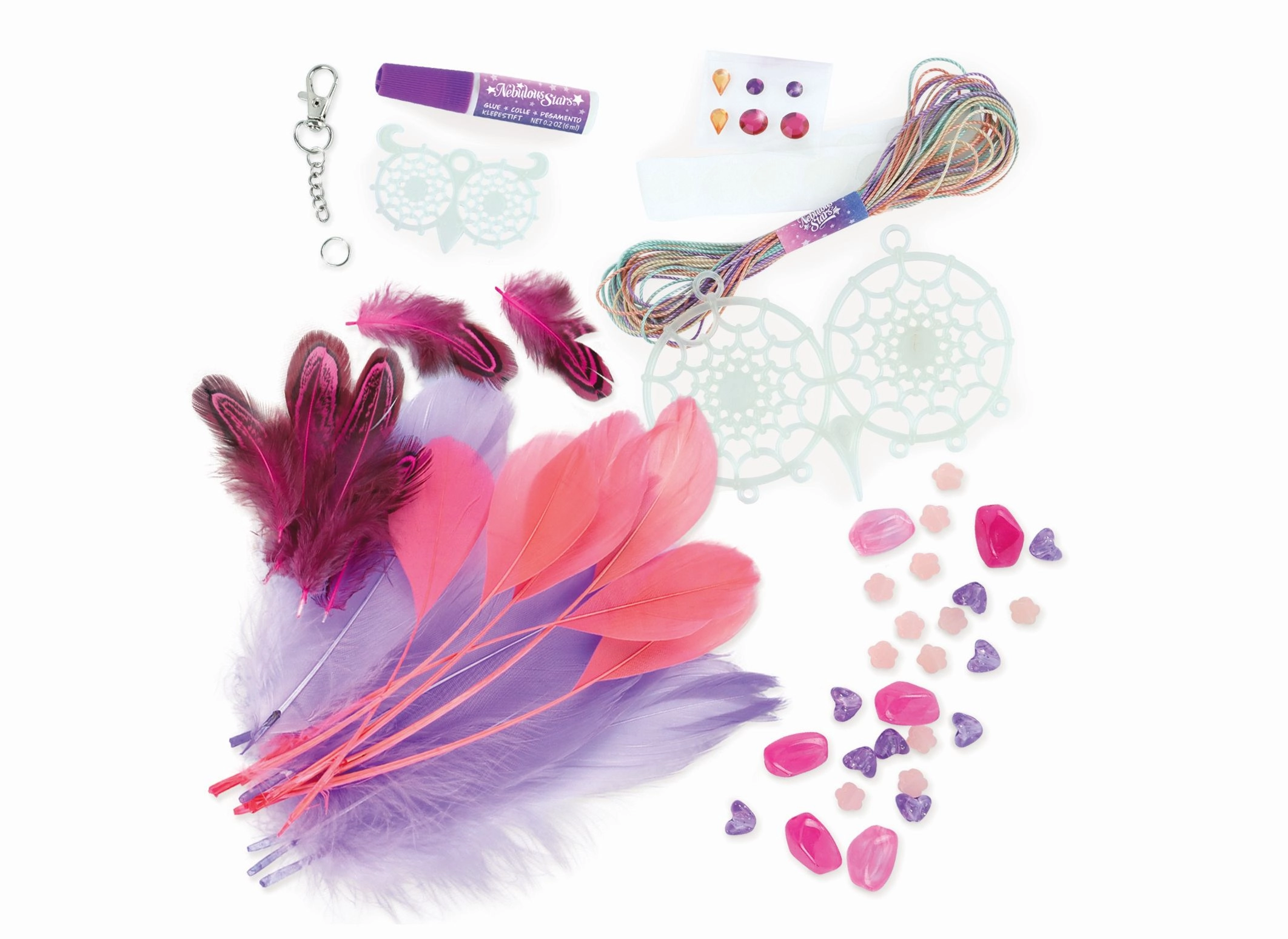 - 2 bases de atrapasueños, 2 colores de hilo de algodón, 28 plumas, 28 cuentas, 6 pegatinas con gemas, pegamento para bisutería