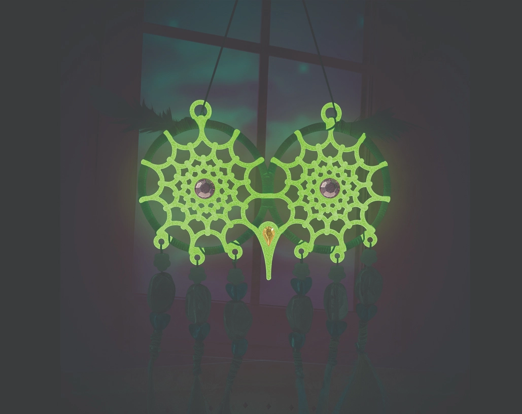Los materiales especiales del atrapasueños, tras cargarse con luz, emiten un brillo suave, creando por la noche un efecto luminoso relajante y una decoración original para la habitación.
