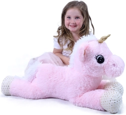 El cuerpo rosa, la crin y la cola blancas, las pezuñas con lunares y el brillante cuerno dorado crean un aspecto de cuento de hadas que encanta a los niños.