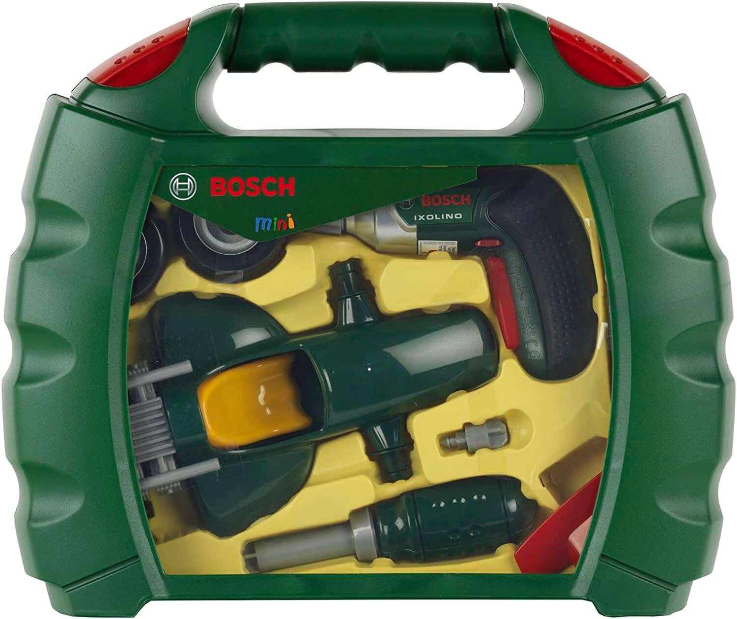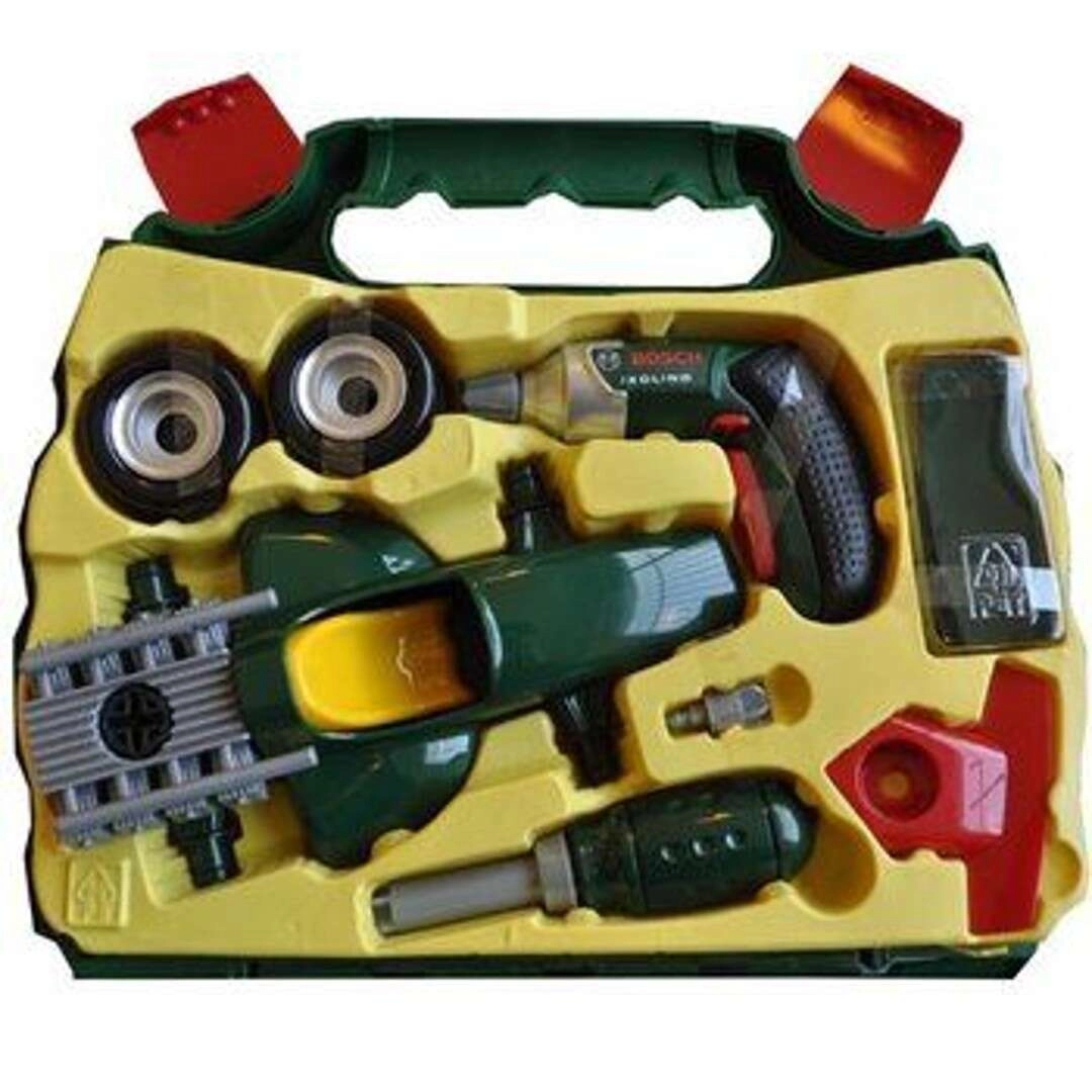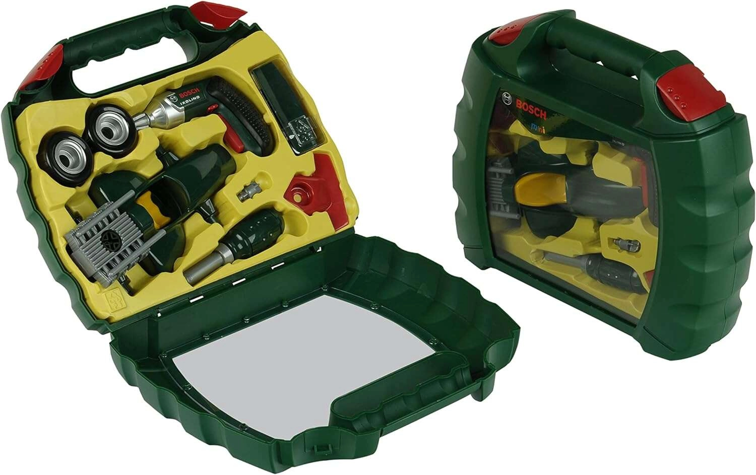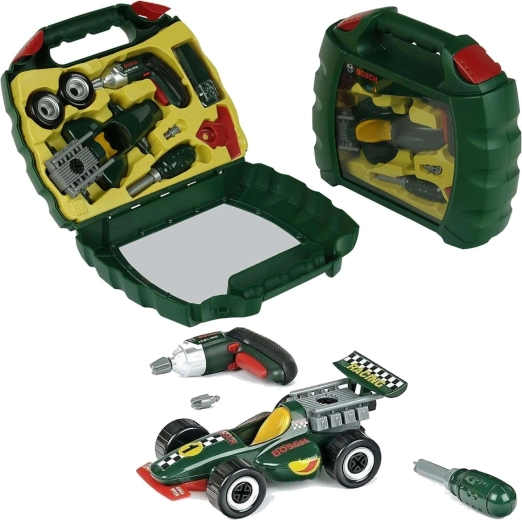 Este set realista con licencia BOSCH mini incluye el atornillador infantil a batería Ixolino con punta giratoria y efecto de sonido, un destornillador, tornillos y todas las piezas necesarias para construir el coche de carreras verde oscuro. Todo está organizado en un resistente maletín de plástico con tapa transparente y asa cómoda, para llevar el juguete a cualquier parte.