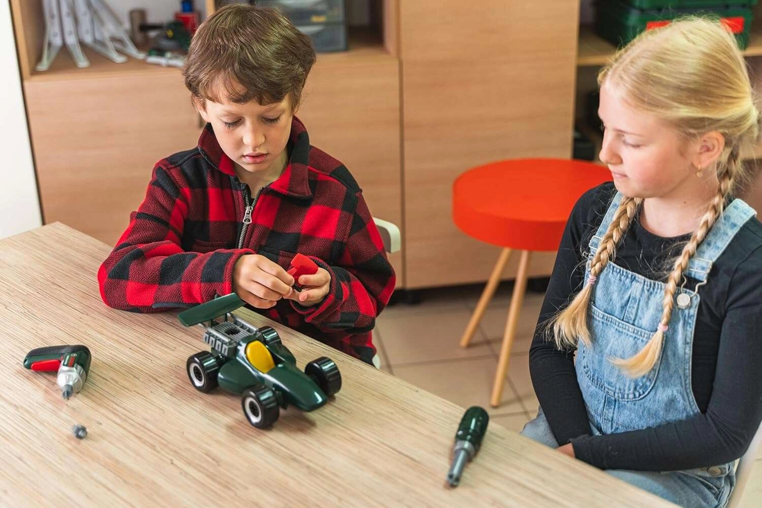Montar y desmontar el coche es intuitivo y seguro. Los niños ejercitan la coordinación ojo–mano, el pensamiento lógico y la paciencia, y además disfrutan de una conducción llena de acción con el modelo terminado. Gracias a las piezas intercambiables (p. ej., alerones) y a las pegatinas, cada pequeño mecánico puede personalizar el vehículo exactamente a su gusto.