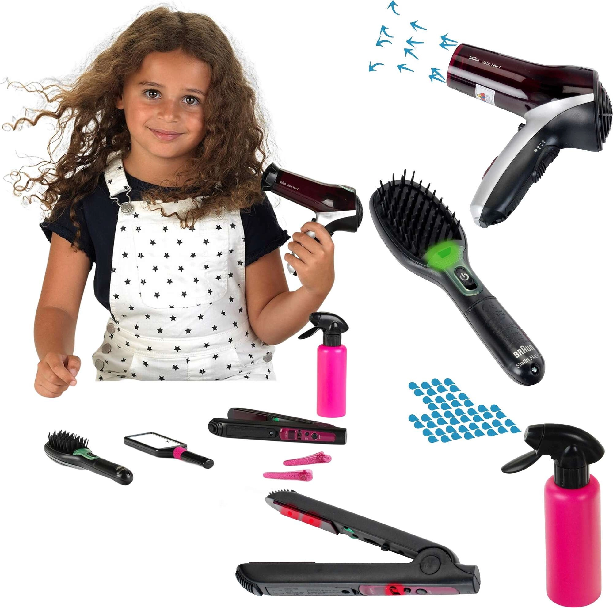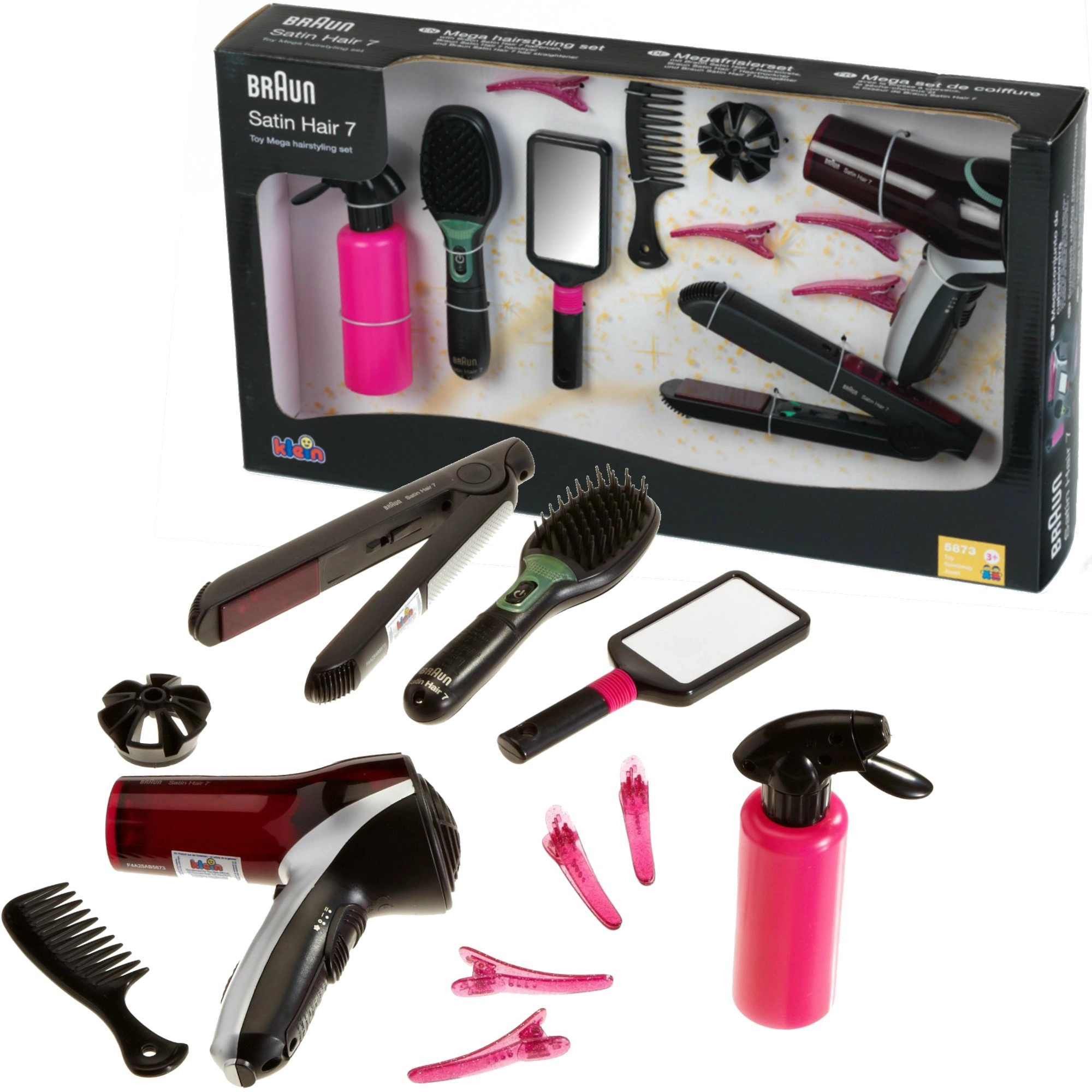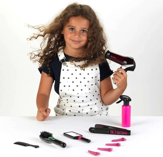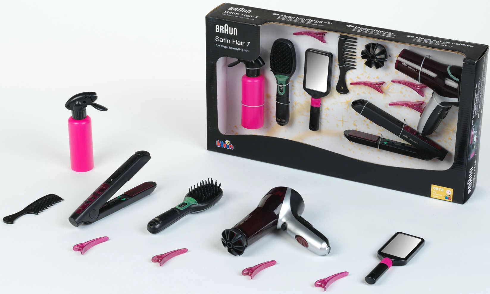 El gran set de peluquería inspirado en la línea BRAUN Satin Hair ofrece a los niños todo lo que necesitan para peinados con estilo. Los juguetes están diseñados con énfasis en la seguridad e imitan herramientas reales: el secador, la plancha y el cepillo funcionan con pilas y generan efectos de luz y sonido realistas, mientras que no producen calor ni flujo de aire.