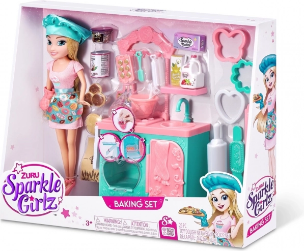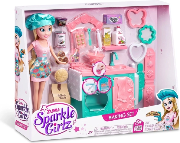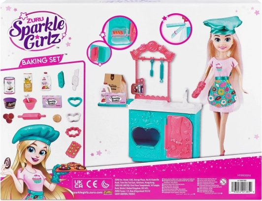 El set contiene elementos esenciales para el juego, incluyendo pequeños alimentos de juguete, cuencos, espátulas y moldes que permiten imitar la repostería de forma realista. Abre el horno, coloca las galletas dentro y finge que se están horneando. Gracias a las prendas intercambiables, la muñeca se puede combinar con otras figuras de la línea Sparkle Girlz.