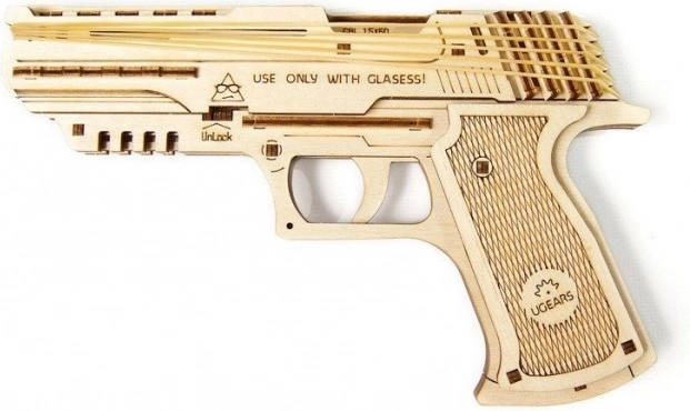 El UGEARS Wolf-01 es una réplica de madera detallada de una pistola con accionamiento por goma elástica que montarás sin pegamento usando únicamente piezas cortadas con precisión. Una vez ensamblado, obtendrás un modelo mecánico funcional que dispara gomas de forma fiable y te muestra en la práctica cómo cooperan los engranajes, el mecanismo del gatillo y la elasticidad de los materiales.