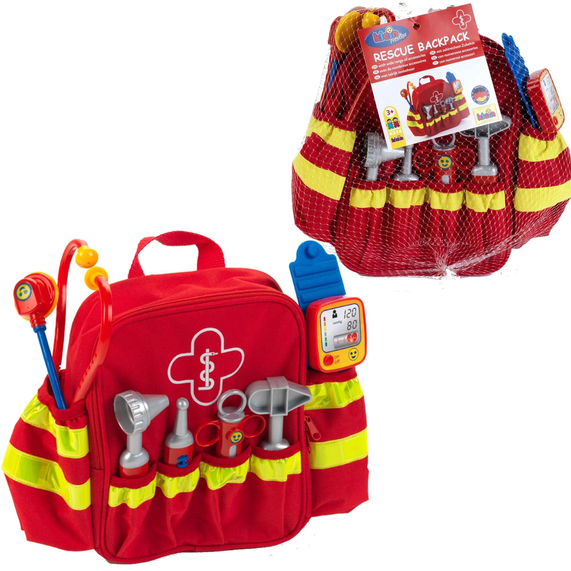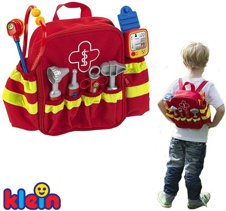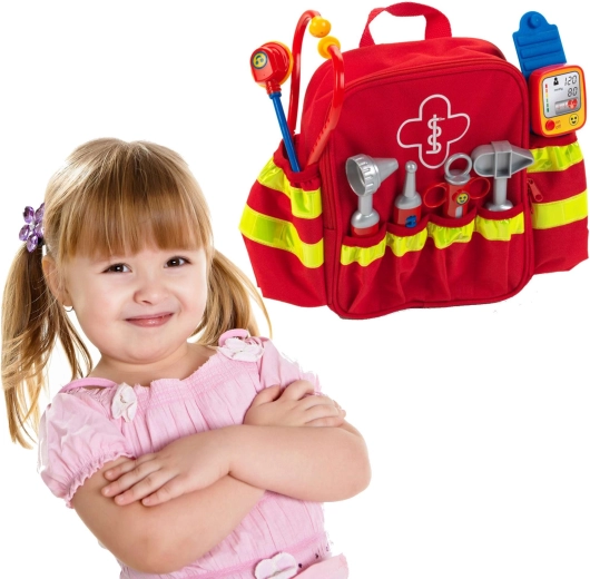 El set incluye seis herramientas clásicas de “consulta”: estetoscopio para escuchar el corazón, otoscopio para los oídos, termómetro, martillo de reflejos, jeringa y tensiómetro. La alta calidad y los bordes suaves garantizan que el juego sea seguro para niños a partir de 3 años. Gracias a los tirantes ajustables, la mochila se adapta cómodamente a la mayoría de preescolares.