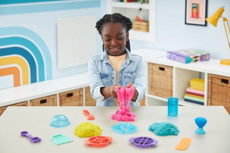 La arena se adhiere a sí misma, no a las manos ni a la mesa. Tras jugar, guarda todo en la bolsa reutilizable – orden rápido, más tiempo para divertirse.