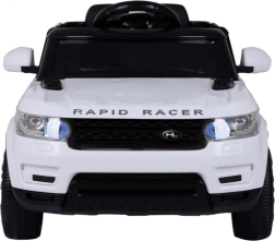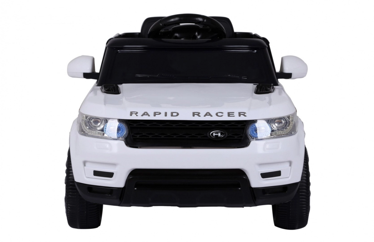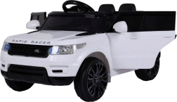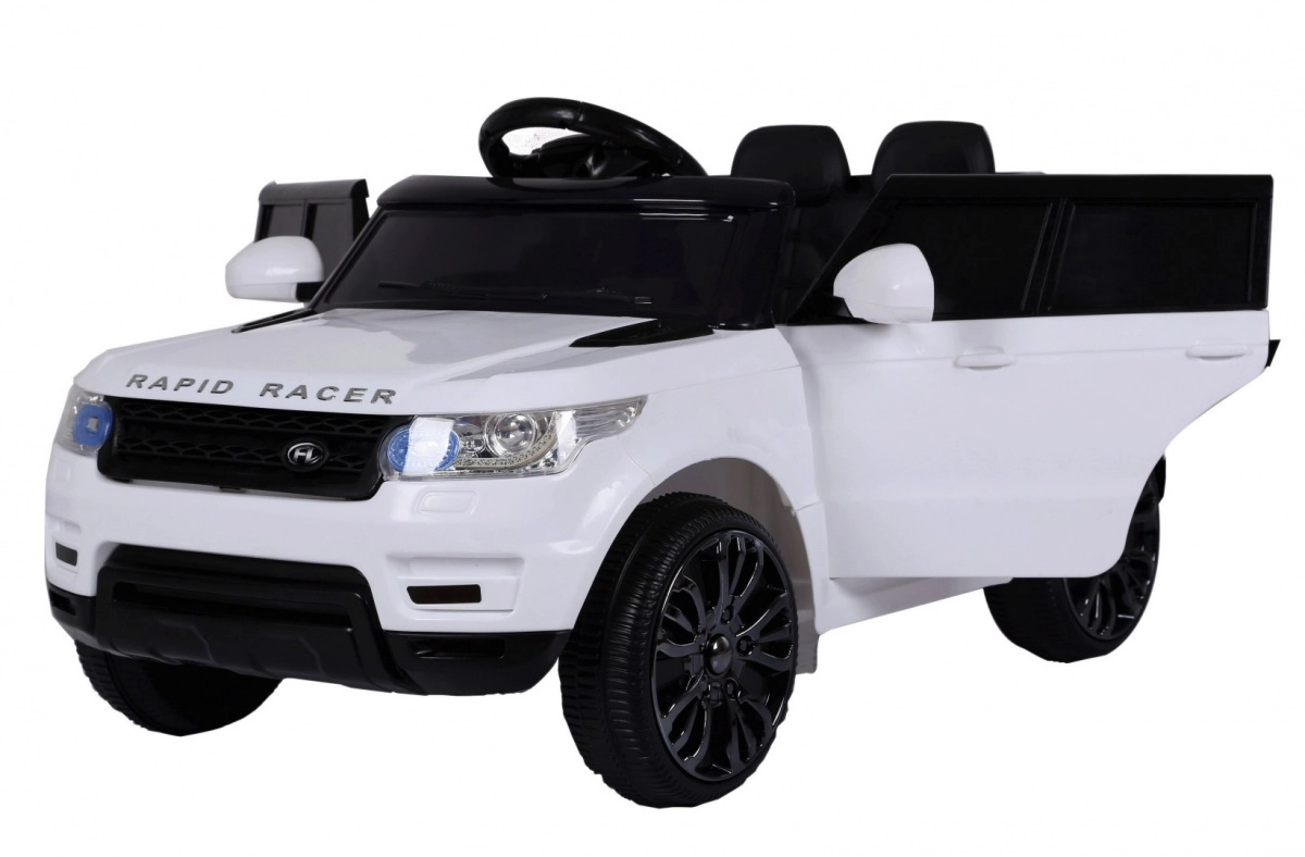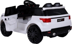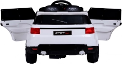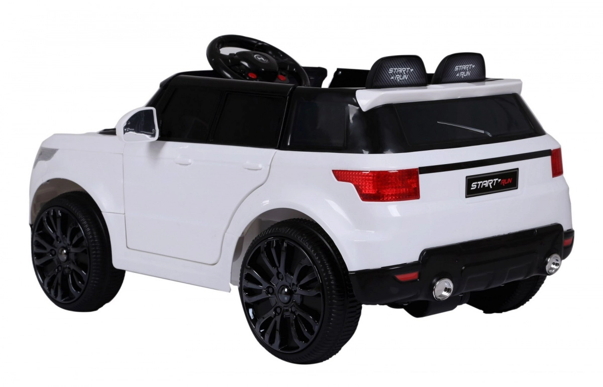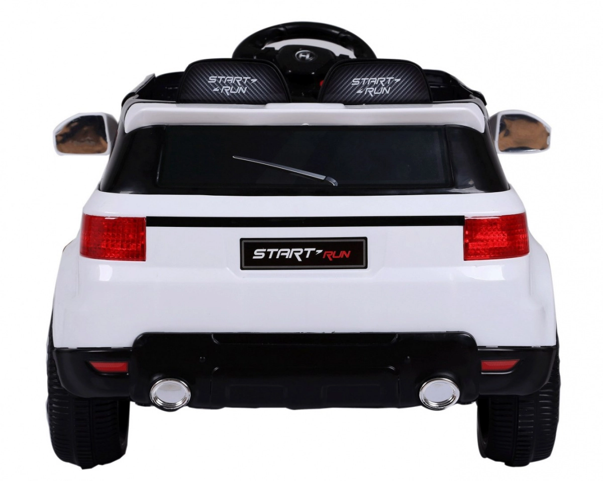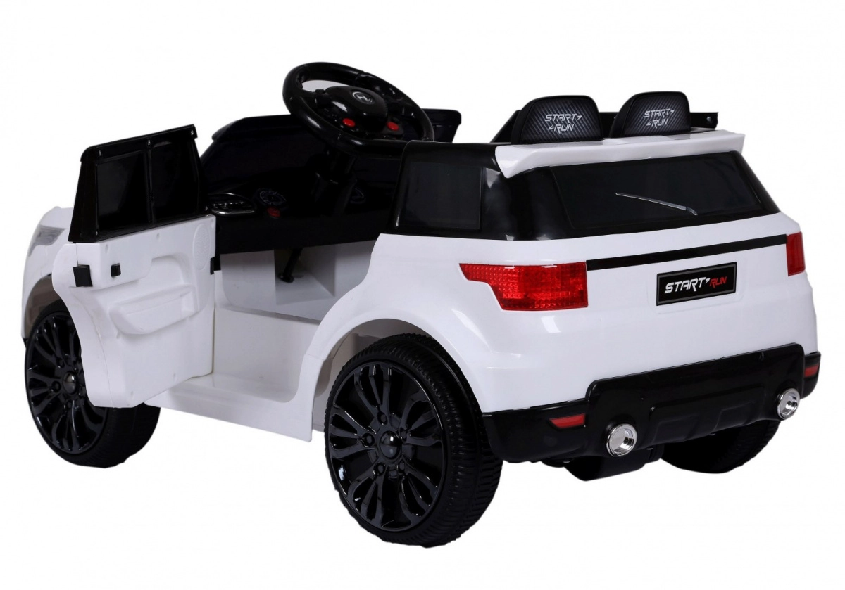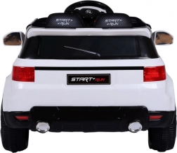 Elegante coche eléctrico infantil SUV START RUN en color blanco con dos motores 2 × 30 W, control remoto 2,4 GHz con botón de STOP, luces LED y un completo panel de audio (MP3/USB/SD/AUX). Gracias a las puertas abatibles con bloqueo, los cinturones de seguridad y los amortiguadores delanteros y traseros, los niños disfrutan de una conducción cómoda y segura.