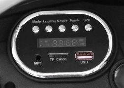 Los padres valorarán el mando a distancia de 2,4 GHz con 3 velocidades y botón de parada de emergencia STOP. Los niños disfrutarán del panel de audio con MP3, USB, SD y AUX, incluidas melodías integradas y claxon en el volante. La comodidad la proporciona el asiento con cinturones de seguridad y cuatro amortiguadores (2× delante, 2× detrás).