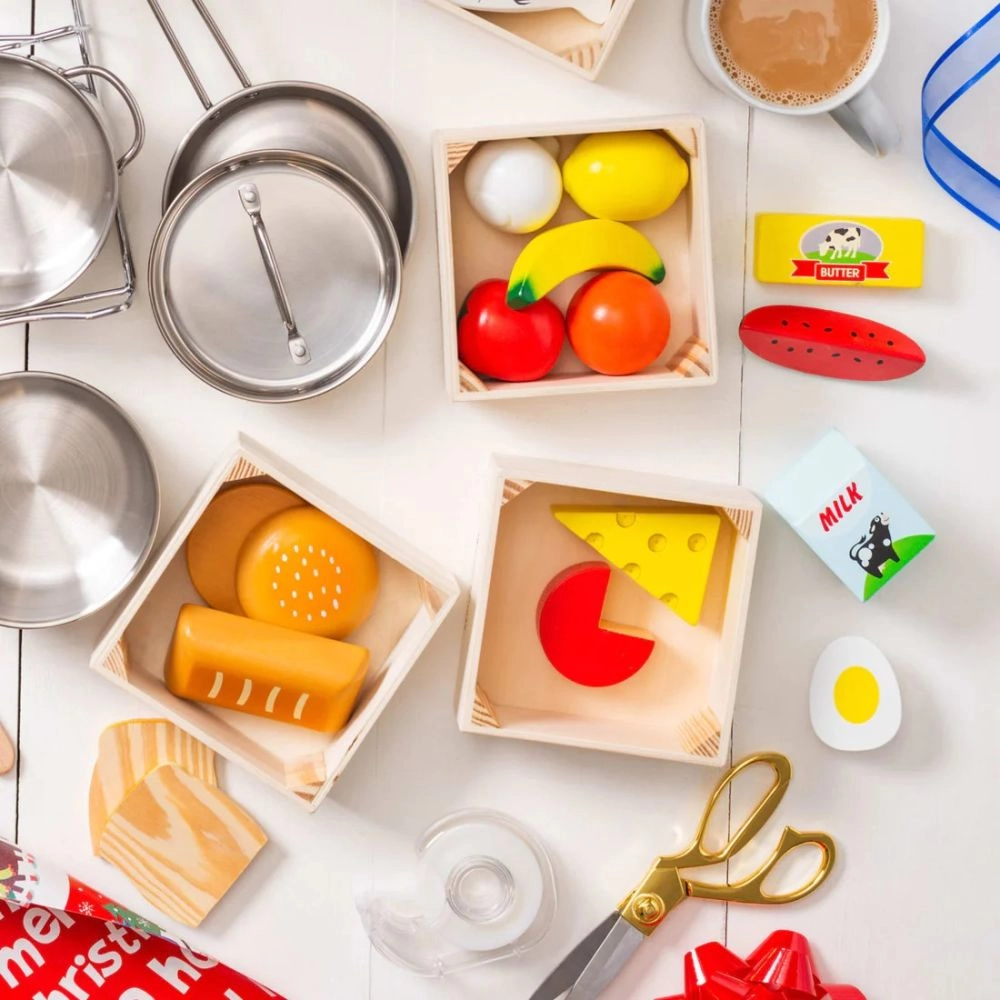 Este set de alimentos de madera incluye cuatro pequeñas cajitas que contienen distintos alimentos como leche, queso y pan. Está diseñado para el juego creativo, que ayuda a los niños a desarrollar la motricidad fina y la imaginación.