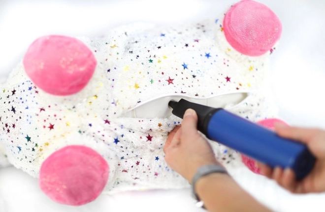 El unicornio saltarín se infla fácilmente con la bomba manual incluida. Listo para jugar en un momento: núcleo elástico, agarre cómodo y dimensiones de 60 × 50 × 25 cm.