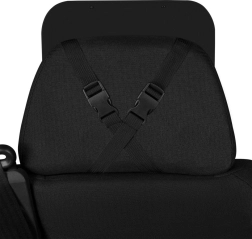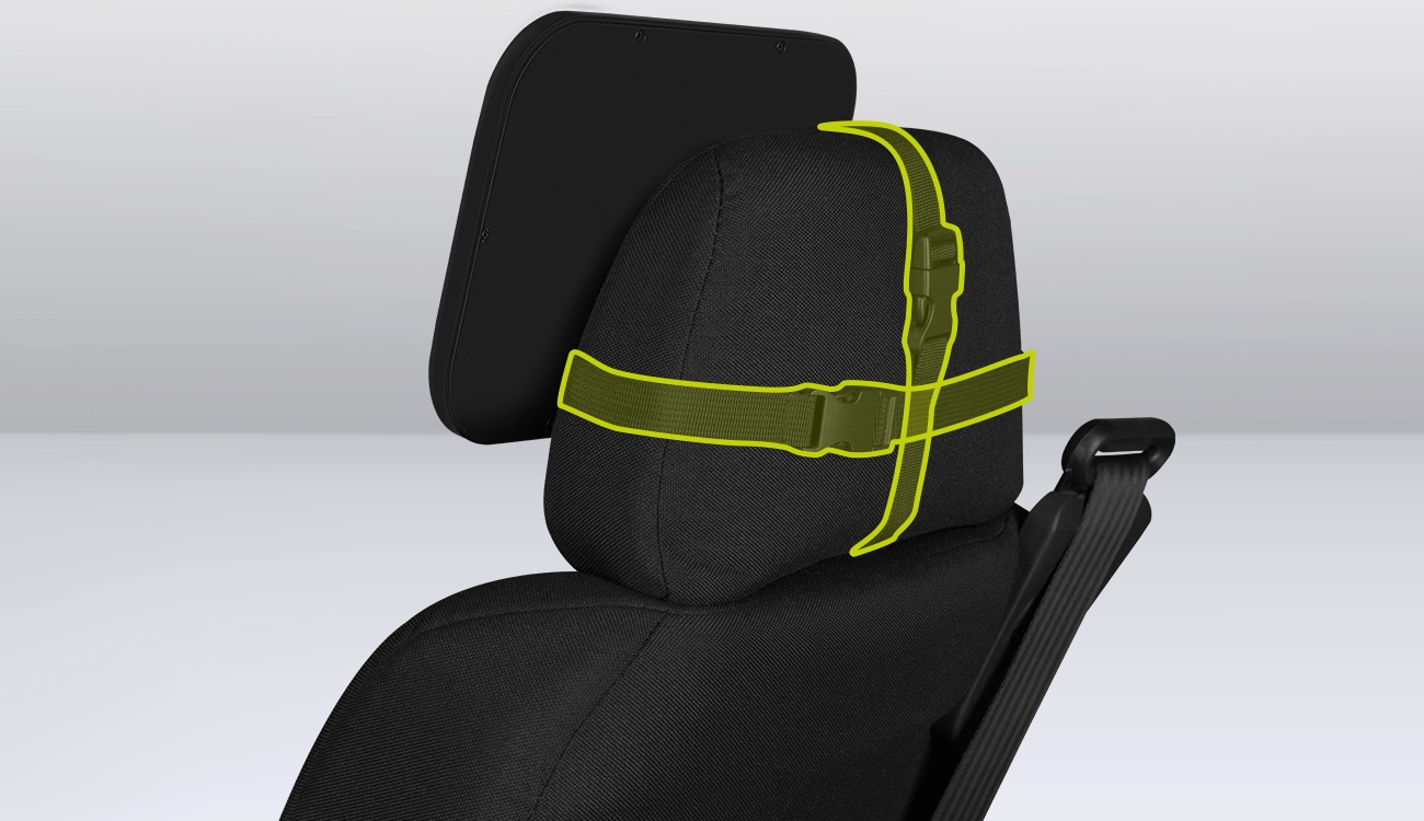 Fijación sencilla al reposacabezas mediante una correa ajustable y hebilla. La rótula de 360 grados permite ajustar la posición libremente.
