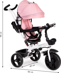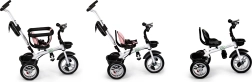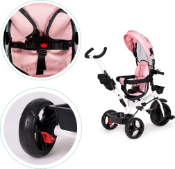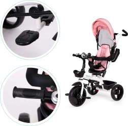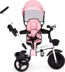Este triciclo ECOTOYS está equipado con una estructura de acero resistente, que garantiza una larga vida útil. Gracias al asiento giratorio se puede cambiar fácilmente la dirección, lo que aprecian especialmente los niños más pequeños. La capota desmontable, las barras de seguridad y el asa de dirección añaden versatilidad y opciones de personalización.