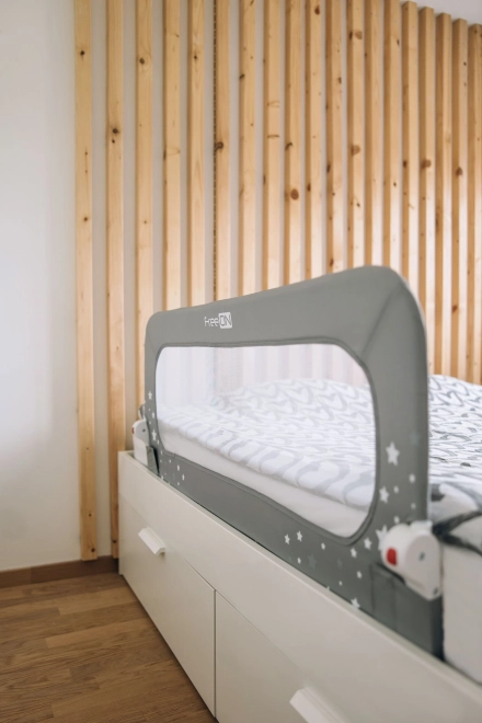 La práctica barrera FreeON Estrellitas está diseñada para un sueño seguro de niños de 18 meses a 5 años. Ofrece una estructura metálica resistente, funda de calidad con estampado de estrellas y malla transparente para supervisar al niño y mejorar la circulación del aire. Se instala fácilmente bajo el colchón mediante correas de longitud ajustable y puede abatirse 180° sin desmontaje.