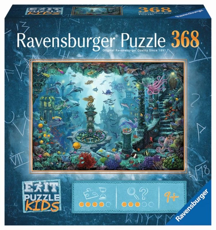 ¡Descubre la aventura con un rompecabezas y un juego de escape en uno! Ravensburger rompecabezas de escape Kids Atlántida Sumergida trae 368 piezas que, una vez armadas, se convierten en un emocionante desafío de símbolos, cifrados y acertijos. Te espera una historia, enigmas y búsqueda de pistas directamente en la imagen. Ideal como diversión para niños a partir de 9 años y para compartir en familia.