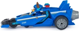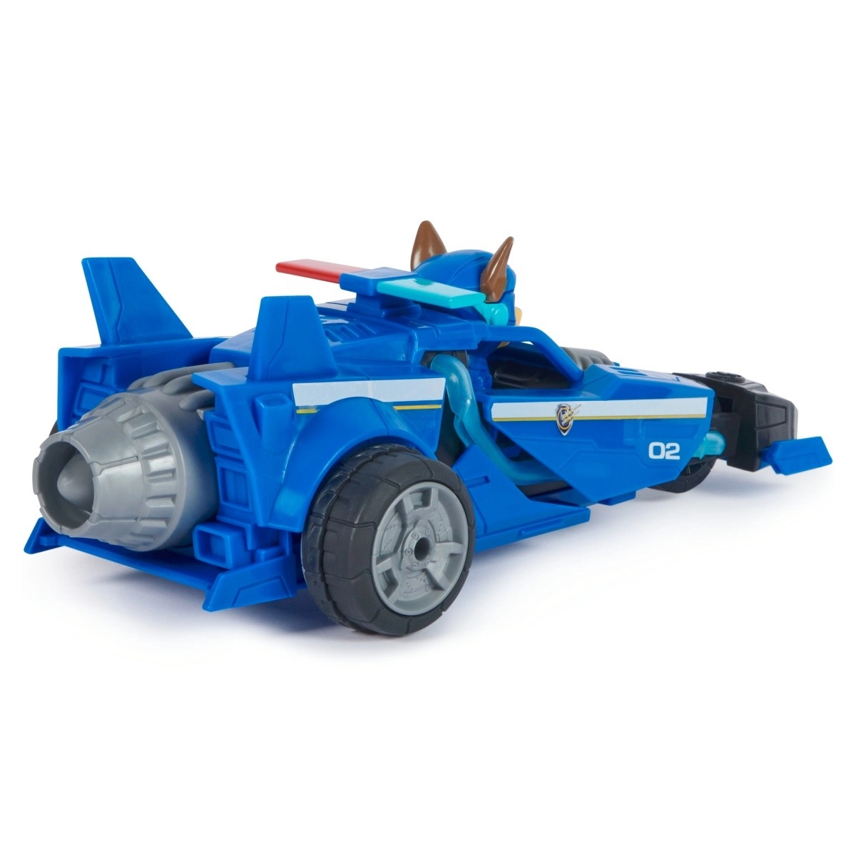 Coche policial detallado con el número 02, elementos aerodinámicos y figura de Chase, exactamente como en Patrulla Canina: La Película.