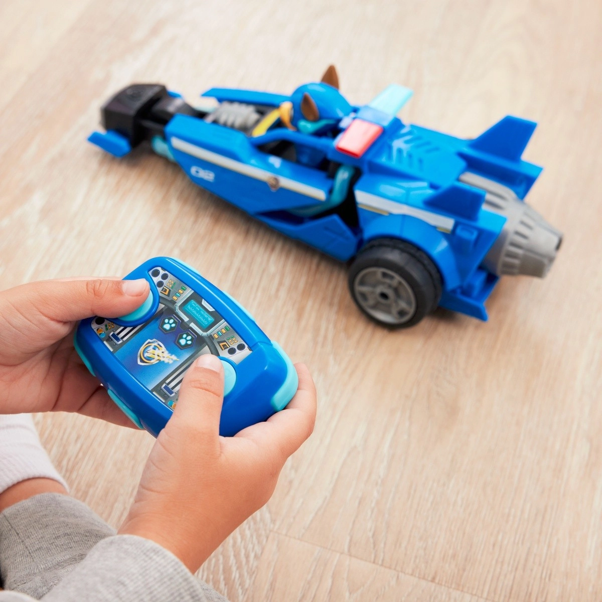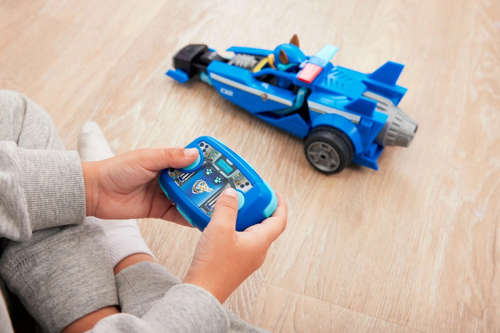 Vive la acción como en la película Patrulla Canina con el coche policial azul de Chase con control remoto de 2,4 GHz. Los niños pueden avanzar y girar 180° con facilidad gracias al mando de dos botones. El coche cuenta con grandes ruedas traseras, “aletas” aerodinámicas, el número 02 y una cabina detallada con la figura de Chase.