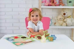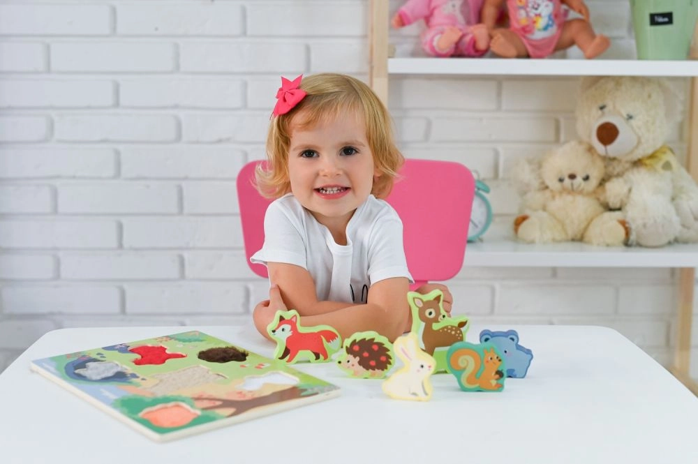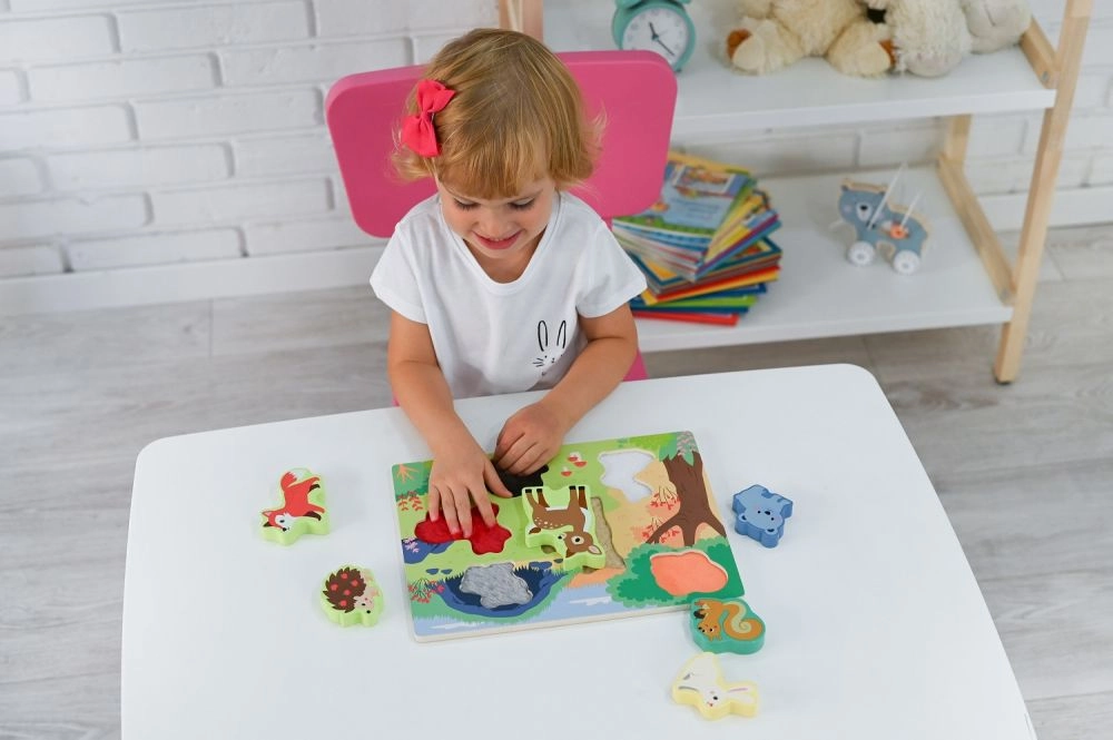 Gracias a su superficie lacada resistente y a los bordes lisos, el juguete es adecuado para el uso diario. Favorece la coordinación ojo–mano, la paciencia y la concentración, mientras los niños descubren de forma natural los animales del bosque.