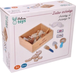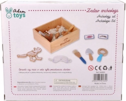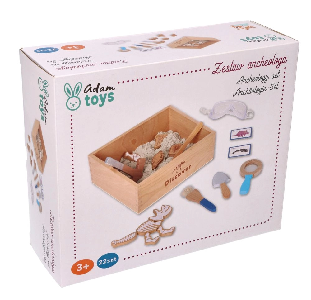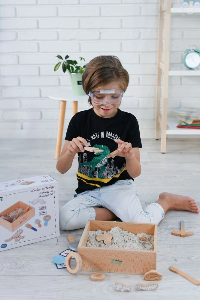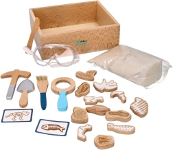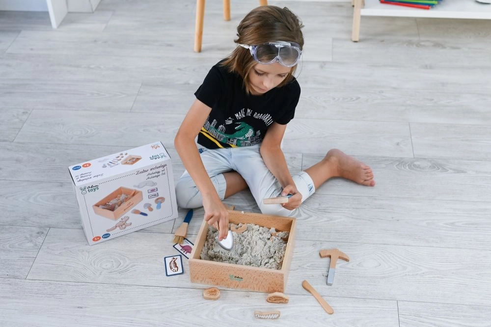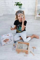 El paquete incluye todo lo que un pequeño paleontólogo necesita: desde un cofrecito de explorador y herramientas (martillito, lupa, cuchillito, pincel, pala) hasta huesos de dinosaurio, peces y fósiles. Dos tarjetas de doble cara ayudan a identificar fácilmente los hallazgos excavados. La arena está fabricada en la UE y cumple las normas de seguridad.