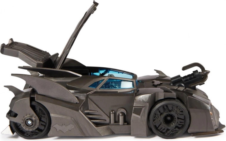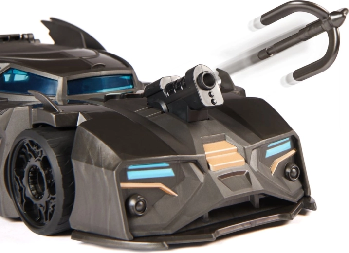 Cargue el gancho y presione el emblema del murciélago en el capó: el lanzador aporta dinamismo y tensión a cada persecución.