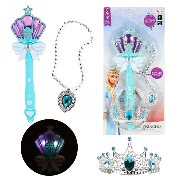 Este encantador set está creado para las pequeñas amantes de los cuentos. La varita con efectos de luz y melodías estimula la imaginación, mientras que la corona con piedras azules y el collar con colgante turquesa completan un look real. Gracias a su fabricación en plástico seguro y su bajo peso, jugar es cómodo y divertido.