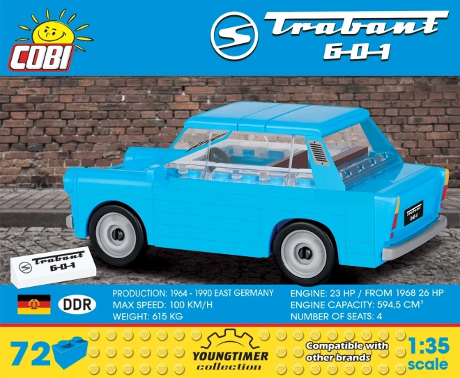 ¡Construye el legendario vehículo a escala 1:35! Este kit COBI Trabant 601 incluye 72 piezas y reproduce fielmente las icónicas líneas de este clásico de la RDA. Ideal como modelo de colección, pero también para juego creativo. Las piezas son compatibles con otras marcas, cuentan con impresiones duraderas y cumplen con las normas de seguridad.