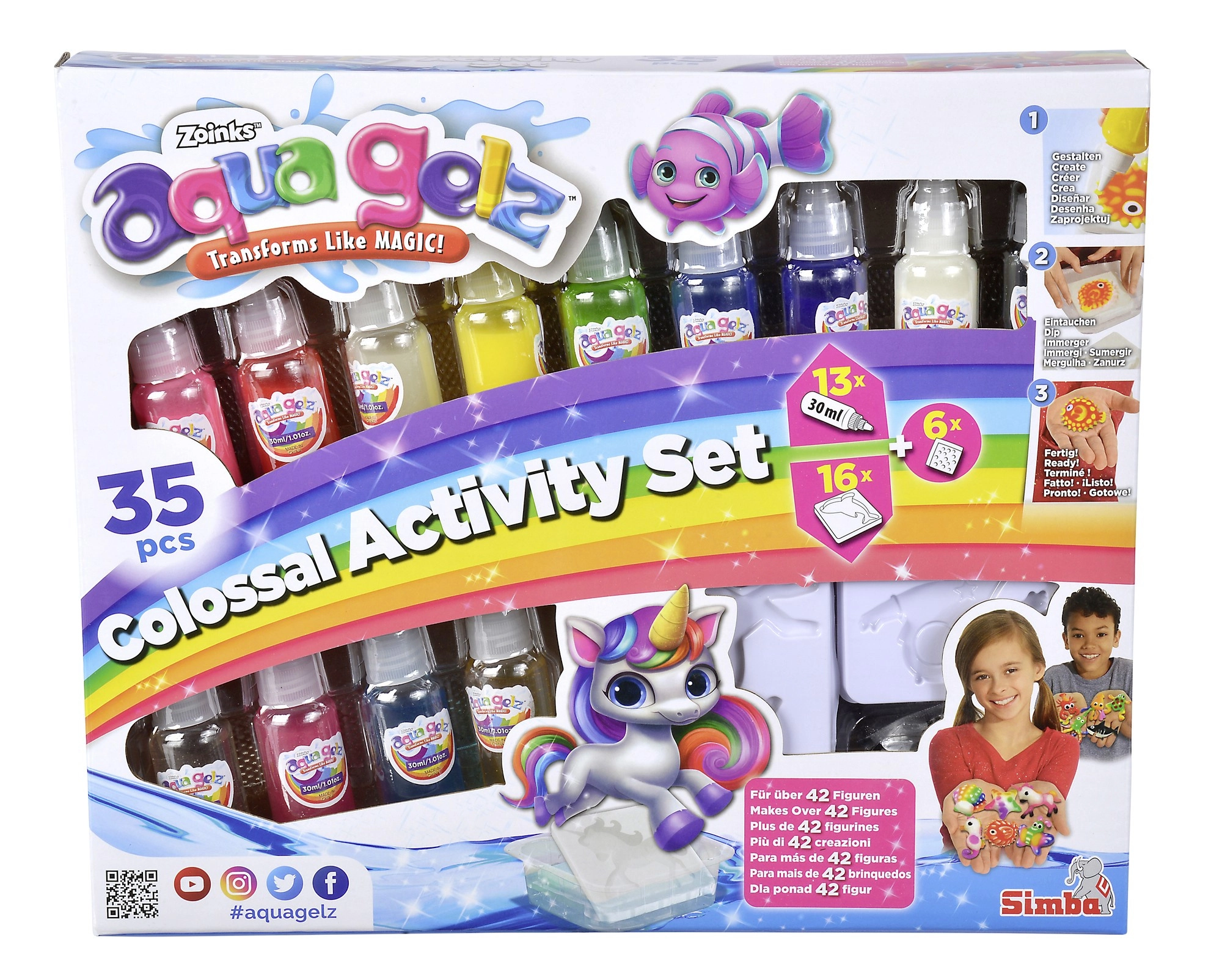 Con el gran set creativo Aqua Gelz, los niños crean fácilmente sus propias figuras y decoraciones de colores. El proceso es sencillo: disuelve el polvo en un cuenco con agua, elige un motivo, rellena el molde con los geles de colores y sumérgelo suavemente: en pocos segundos nace una figura 3D con volumen que emerge por sí sola del molde.