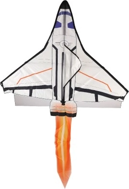 Esta cometa está creada con forma de transbordador espacial en una combinación de colores blanco, negro y naranja que imita el aspecto de un transbordador real.