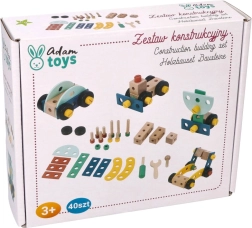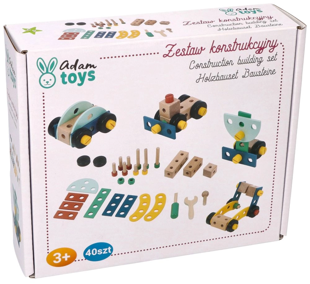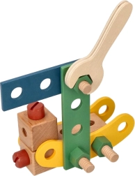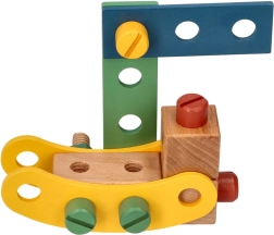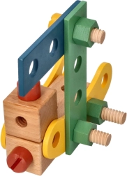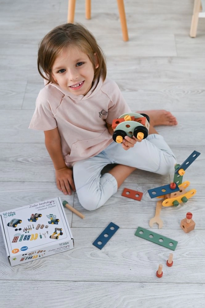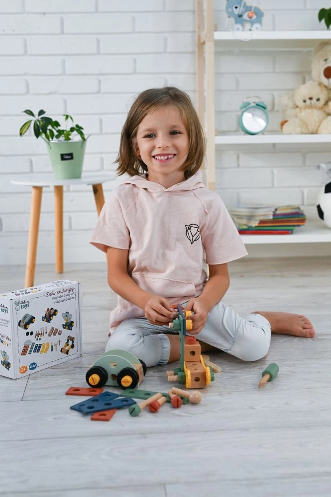 Presentamos el exclusivo juego de construcción de madera para niños, que favorece la coordinación mano-ojo, el pensamiento lógico y la creatividad. El set incluye tornillos, listones, tuercas, ruedas y también un destornillador y una llave: todo lo necesario para montar vehículos.