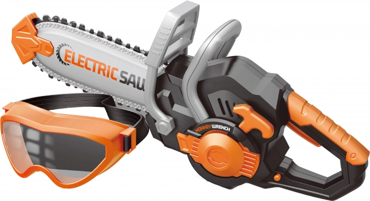 Las gafas de protección garantizan la seguridad durante el juego. El botón en el lado izquierdo permite una activación sencilla de la sierra, lo que contribuye a una experiencia de juego realista.