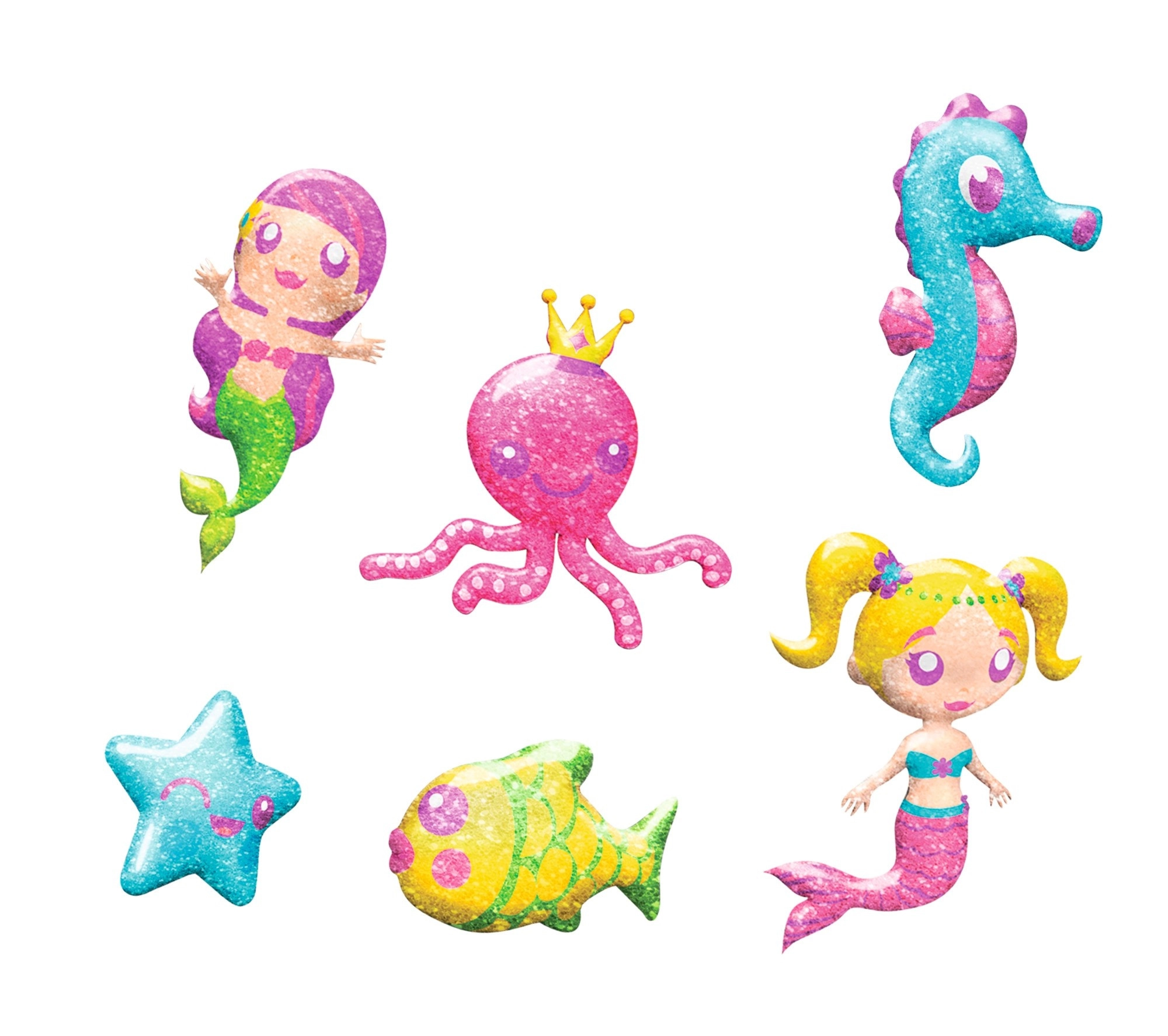 Los frascos aplicadores con boquilla fina facilitan el coloreado y los detalles pequeños. Los brillos aportan un encanto reluciente a las figuras marinas.