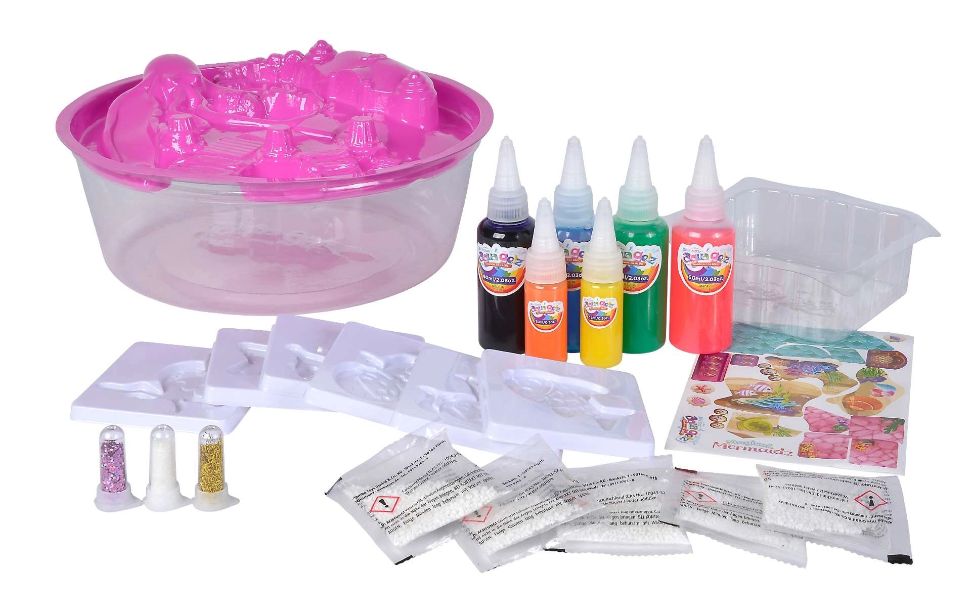 El set Aqua Gelz Sirenas mágicas ofrece a los niños diversión sin fin con agua o en la mesa. Con una solución especial y geles de colores, crearán en un instante figuras 3D de criaturas marinas y sirenas. Gracias al proceso sencillo y a los frascos aplicadores precisos, crear es fácil, limpio y cautivador.