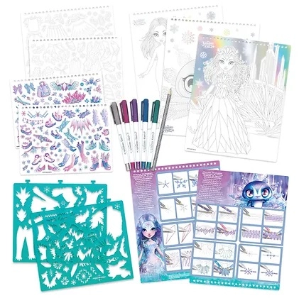 El paquete incluye abundantes accesorios: bolígrafos de gel metálicos para detalles llamativos, plantillas de plástico para contornos precisos, pegatinas incluyendo algunas para colorear y un lápiz para bocetar. Las páginas temáticas con el personaje Iceana invitan a colorear, decorar y diseñar tus propias ilustraciones.