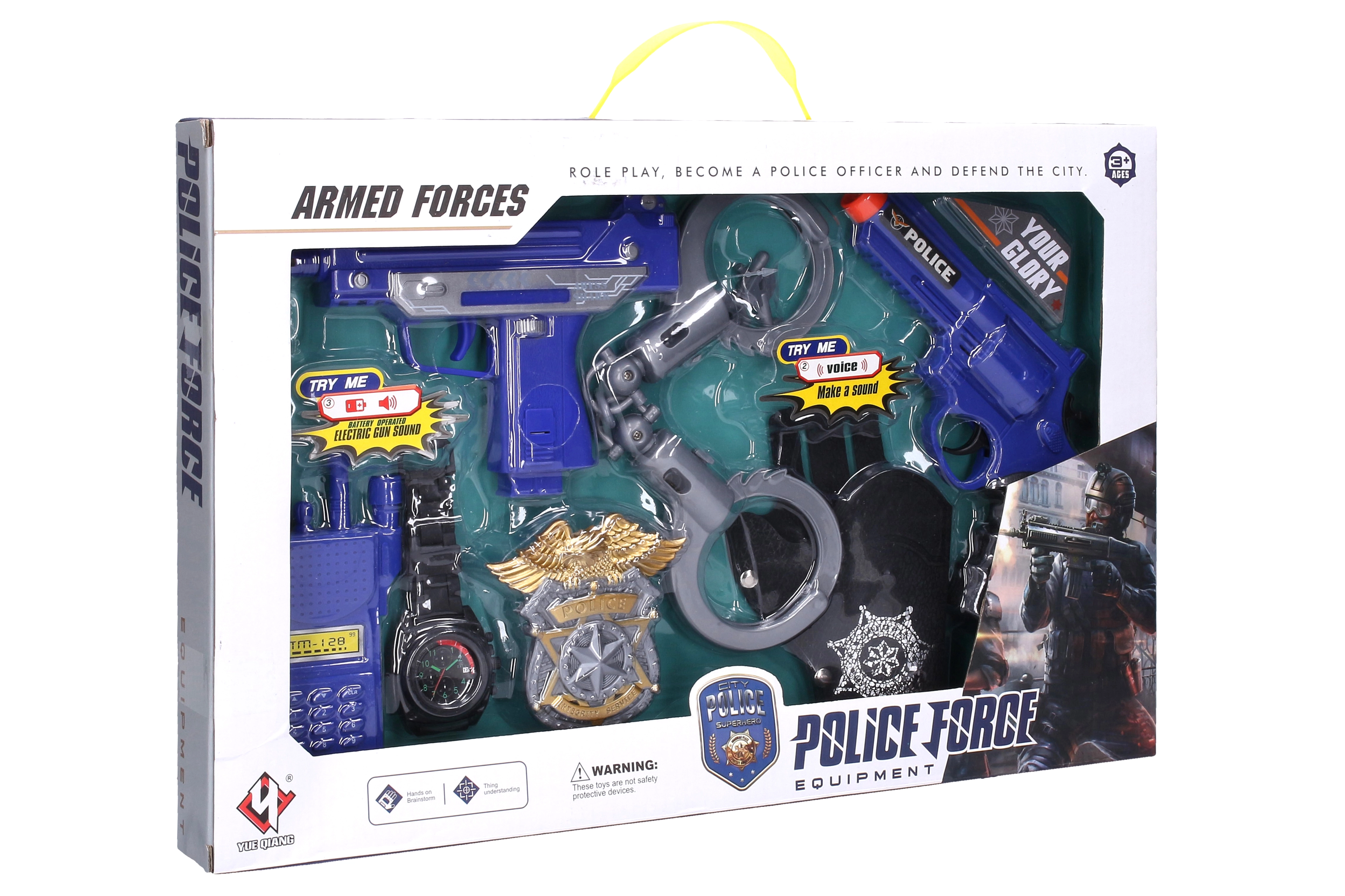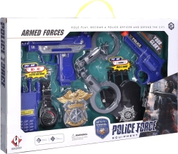 - Subfusil 18 cm (efectos de sonido), pistola 18 cm con funda (efectos acústicos), esposas con llave, walkie‑talkie, reloj, insignia