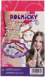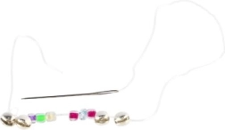 - cascabeles, cordón elástico, 3 hilos de algodón de colores, anillas de unión, 2 recipientes con cuentas, aguja, instrucciones