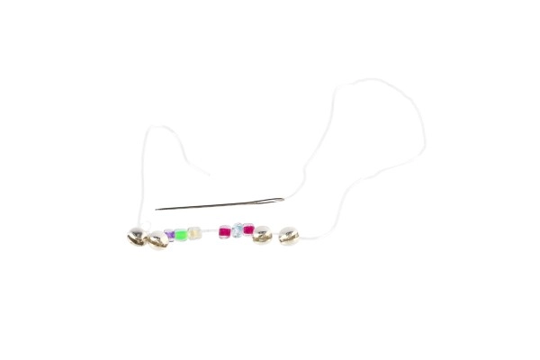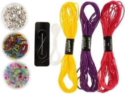 - Equipamiento completo: cascabeles, cordón elástico, 3 hilos de algodón de colores, anillas de unión, 2 recipientes con cuentas, aguja, instrucciones