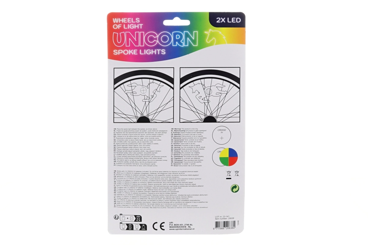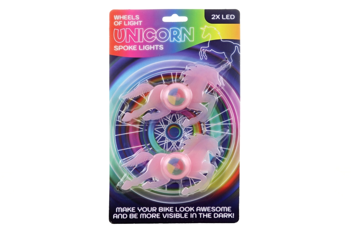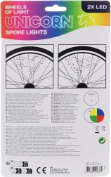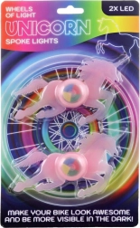 Aumenta tu visibilidad y añade un toque de magia a tu ruta en bicicleta con estas elegantes luces LED para bicicleta con diseño de unicornios. El paquete incluye dos elementos luminosos que se fijan fácilmente a los radios de tu bicicleta.
