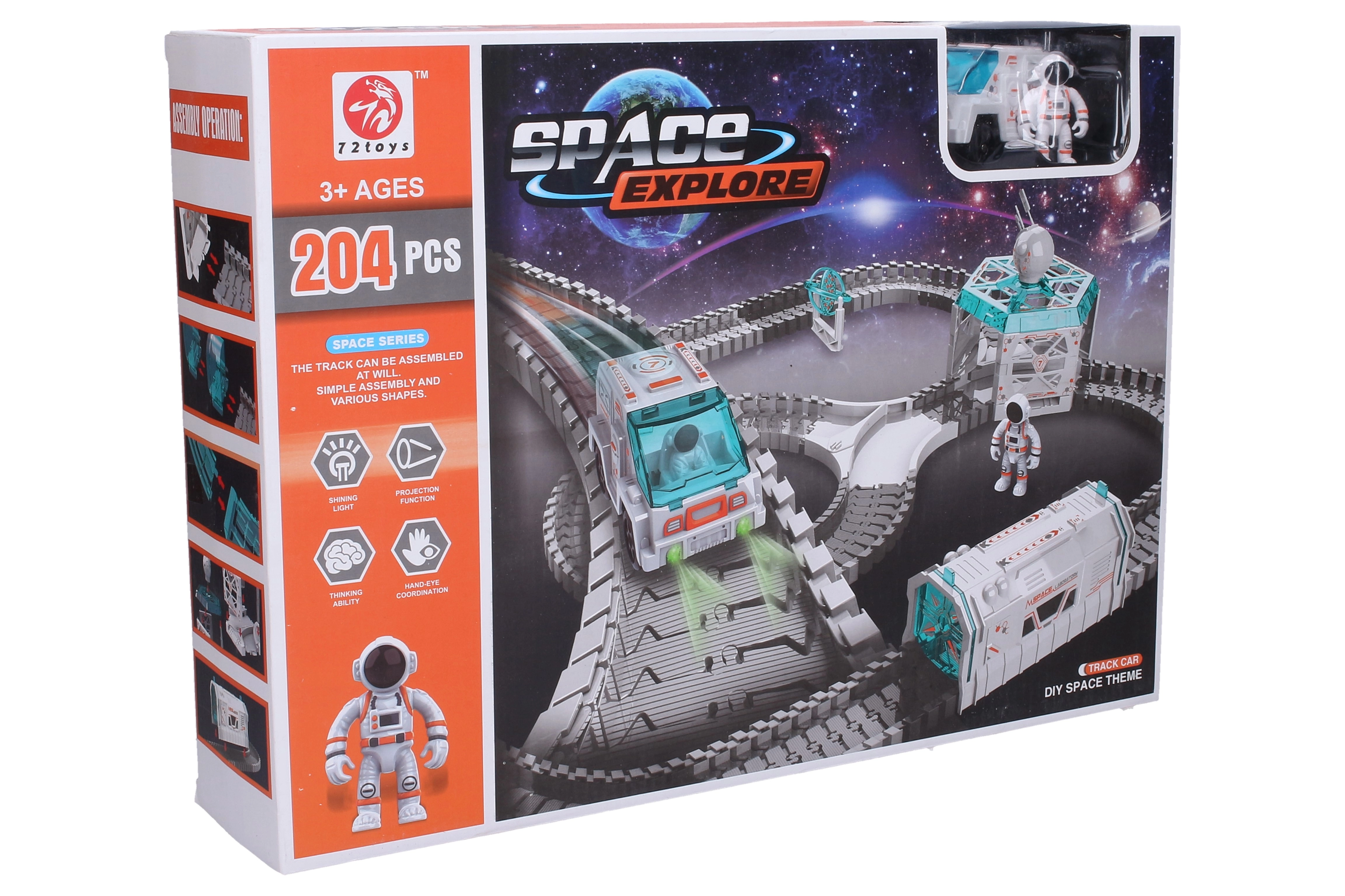 Descubre la aventura espacial con esta pista de carreras cósmica de 85 × 75 × 32 cm. Incluye un coche, una figura de astronauta y un proyector funcional con efectos de luz. La pista se puede montar libremente en diferentes formas, así que la diversión nunca termina.