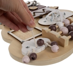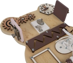 El tablero ofrece diversas actividades que ayudan a desarrollar la motricidad fina y las capacidades cognitivas de los niños.