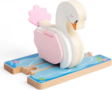 Levanta las alas rosas del cisne y conviértelo en un túnel. A los niños les encantará este sencillo pero mágico elemento mecánico que da vida a cada trayecto.