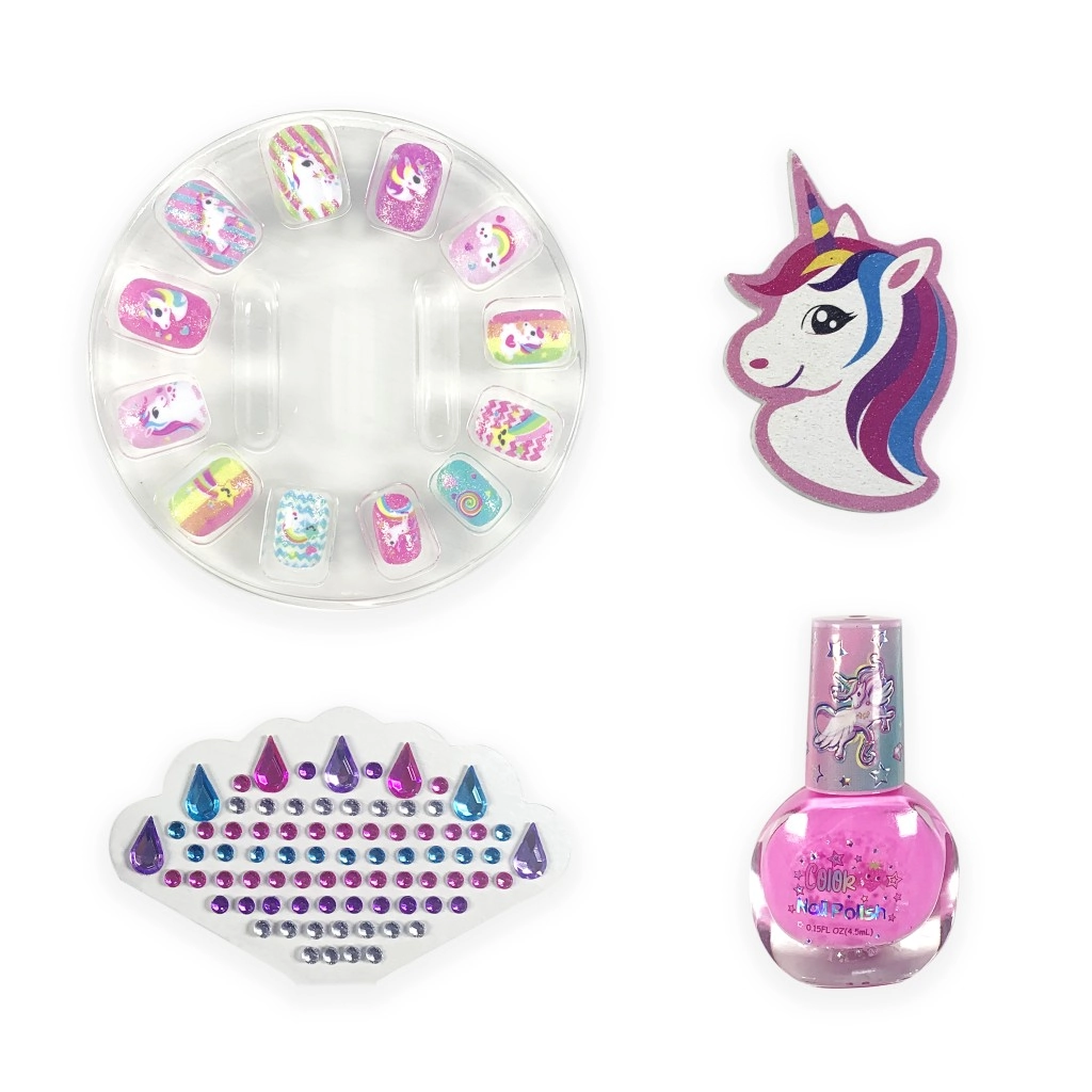 El precioso set de estudio de uñas Unicornio es perfecto para niños que quieren embellecer sus uñas y disfrutar de una diversión creativa. Este set incluye: